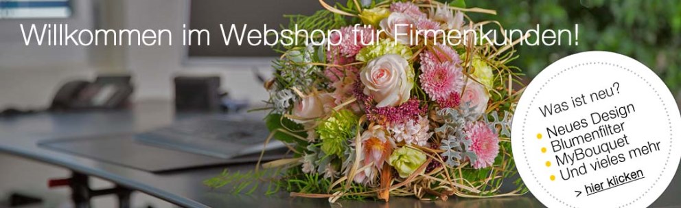Wir begrüssen Sie herzlich im neuen Webshop für Firmenkunden, der Ihnen eine Vielzahl neuer Möglichkeiten (weitere Infos) rund ums Blumen bestellen bietet.